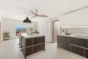 Mediante puertas correderas, el salón-comedor está conectado con la cocina, y a la derecha del comedor se encuentra la zona de dormitorios.
