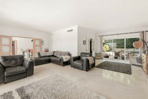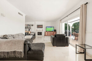 A la izquierda del recibidor se encuentra el salón con chimenea y acceso a las terrazas delantera y trasera.