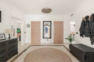 Al entrar por la puerta principal, encontramos un acogedor recibidor con guardarropa y aseo.