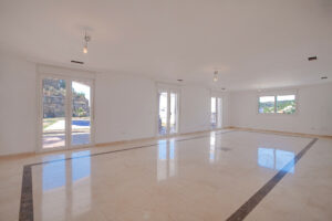 El salón es enorme y se abre a la gran terraza cubierta y al jardín con piscina privada y buenas vistas al mar.