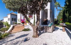 La planta superior cuenta con una impresionante suite principal, además de dos amplios dormitorios de invitados y un baño adicional. Cada dormitorio dispone de su propia terraza privada desde la que se pueden disfrutar de increíbles vistas al campo de golf y a la sierra de fondo. Desde esta planta se accede también a una terraza solárium privada con espectaculares vistas panorámicas de 360 grados al mar y a las montañas.