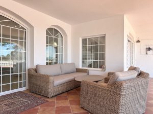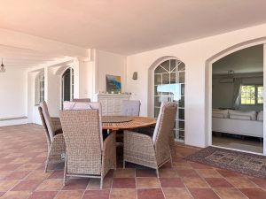 El salón, amplio y luminoso, se abre hacia una gran terraza en la parte frontal de la casa de 150m2, donde se encuentra una piscina de 40 m² rodeada de amplio espacio para tomar el sol. Desde el salón también se accede a una gran terraza cubierta de 65 m², ideal para comer al aire libre, relajarse a la sombra o disfrutar del suave clima mediterráneo durante todo el año.