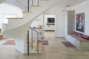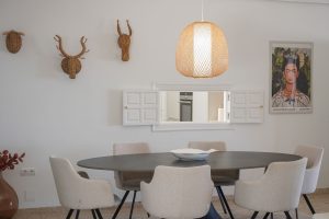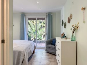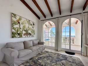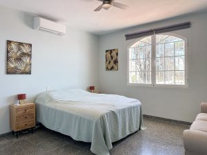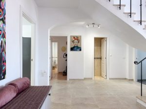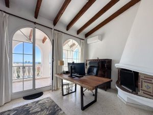 La villa cuenta con 4 amplios dormitorios, todos situados en la planta baja, cada uno con armarios empotrados y baño en suite, además de un lavadero independiente. La entrada conduce a un impresionante hall de doble altura, desde el cual una escalera lleva a la primera planta, donde se encuentra una acogedora oficina con chimenea y acceso a una gran terraza con vistas abiertas al mar.