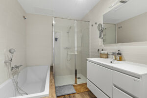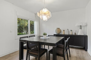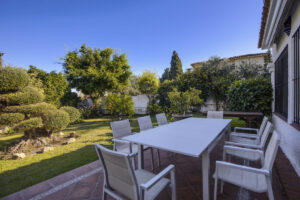 Dos de los cuatro dormitorios disfrutan de baños en suite, mientras que todos se benefician de un amplio almacenamiento y luz natural. La casa está equipada con calefacción central y aire acondicionado, lo que garantiza un confort durante todo el año. En el exterior, la propiedad sigue impresionando con una terraza cubierta con techos vidriados, terraza solitaria y un gran jardín privado orientado al este, perfecto para el sol de la mañana. La piscina cercada ofrece tranquilidad para las familias, y las zonas al aire libre invitan a vivir mediterráneo relajado.