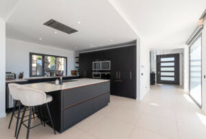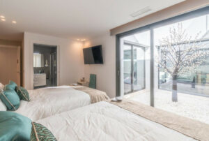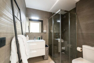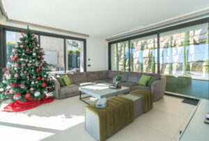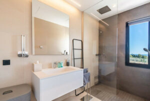 La villa dispone de cuatro amplios dormitorios dobles con diseño sofisticado y cuatro baños completos equipados con materiales de alta gama. Los espacios interiores destacan por su luminosidad, gracias a los grandes ventanales que ofrecen impresionantes vistas al mar Mediterráneo y a las montañas.