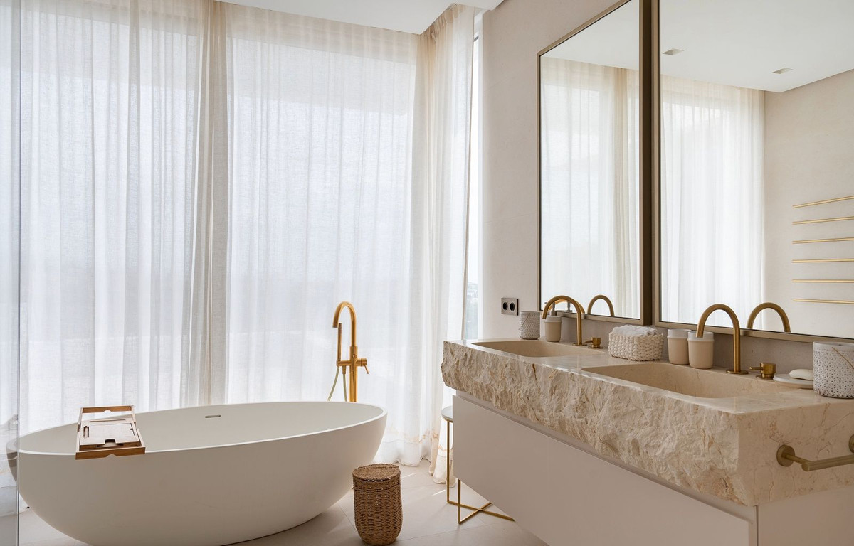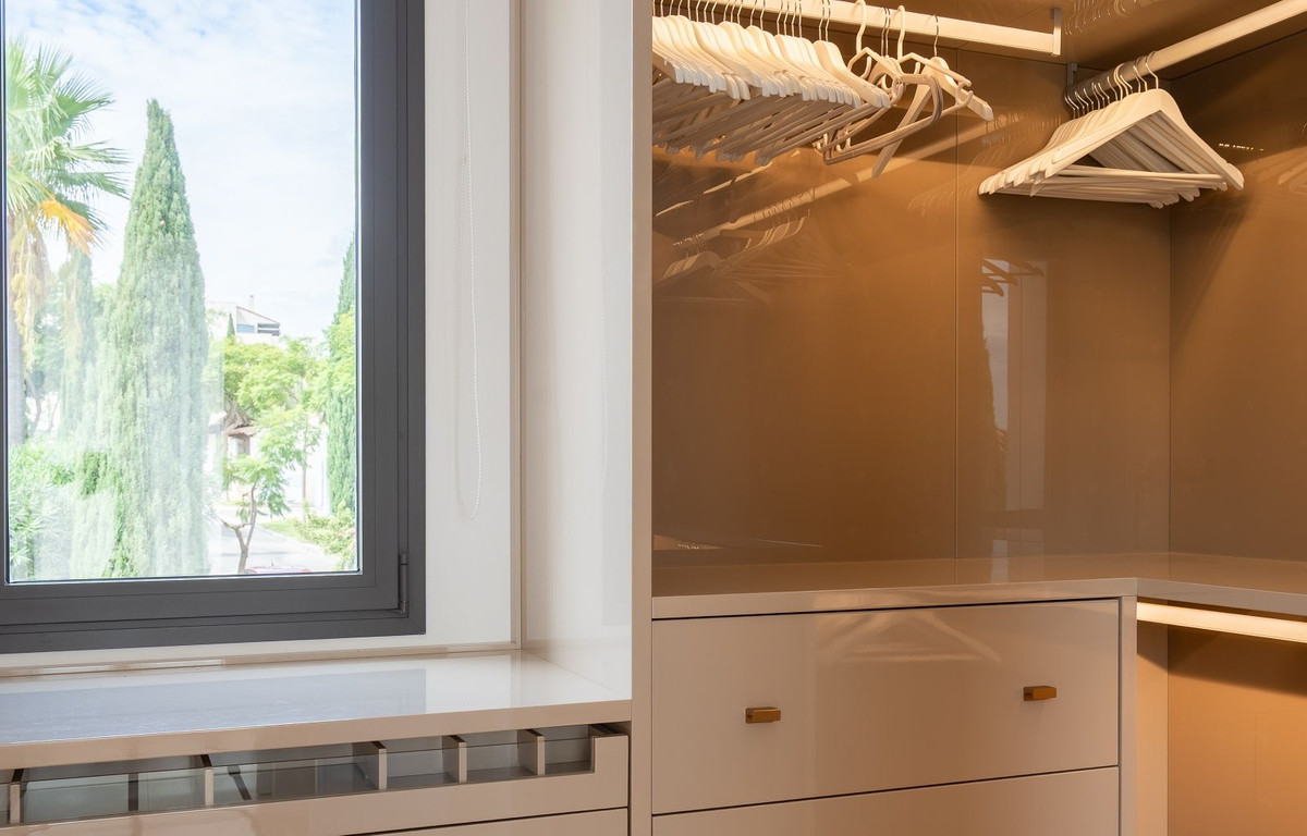 La primera planta alberga dos dormitorios adicionales, entre ellos la lujosa suite principal con dos vestidores y un amplio baño que dispone tanto de una ducha a ras de suelo como de una bañera exenta. Ambos dormitorios disfrutan de acceso a una terraza privada con vistas panorámicas al mar, al campo de golf, a La Concha y al entorno natural.