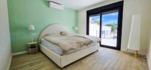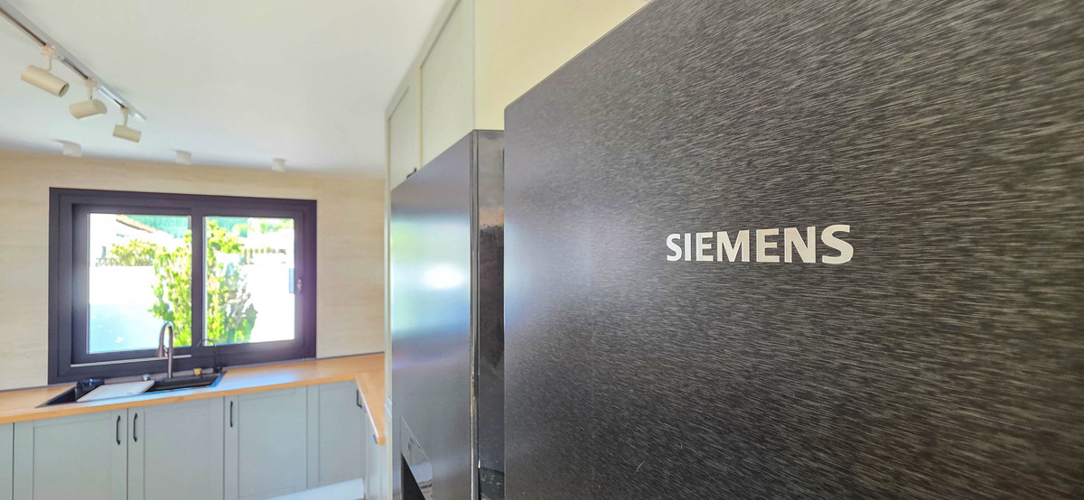 La villa cuenta con cuatro amplios dormitorios y tres baños, todos terminados con materiales y equipamientos de primera calidad. Los baños disponen de suelo radiante, y cada estancia está equipada con una unidad de aire acondicionado independiente de última generación para garantizar el máximo confort durante todo el año. La cocina, moderna y totalmente equipada con electrodomésticos de alta gama, se integra de forma natural con las zonas de estar, llenando la vivienda de luz natural.