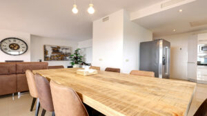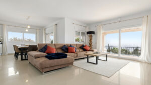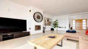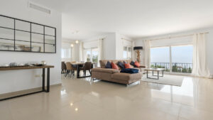 La entrada da paso a un luminoso espacio de planta abierta donde se integran el salón, el comedor y la cocina. A la izquierda se encuentra la cocina de concepto abierto, que fluye hacia el comedor, mientras que justo enfrente el salón ofrece una acogedora chimenea y amplias puertas correderas que enmarcan las vistas al brillante mar Mediterráneo. Tanto el salón como el comedor tienen acceso directo a una espaciosa terraza, ideal para disfrutar de comidas al aire libre o relajarse contemplando las vistas.