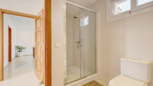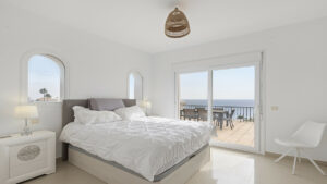 En la planta superior se encuentran otros dos dormitorios dobles, ambos con baño en suite y acceso a amplias terrazas privadas con vistas panorámicas y serenas al mar. El dormitorio principal cuenta además con un elegante vestidor para mayor comodidad.