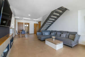 El corazón de la vivienda es un luminoso salón-comedor, inundado de luz natural gracias a sus enormes ventanales de suelo a techo que enmarcan vistas panorámicas al mar. Este espacio fluye de manera natural hacia la cocina abierta, completamente equipada y lista para su uso.