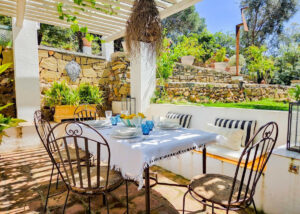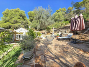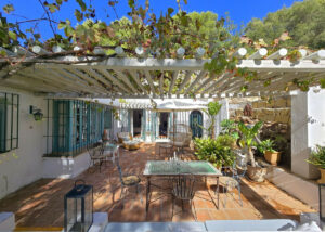 En el corazón de la vivienda se encuentra su encantador patio central: un auténtico refugio al aire libre. Las pérgolas cubiertas de enredaderas ofrecen un comedor y sala e estar de verano perfecto para disfrutar de largas veladas, mientras que el suave murmullo de la fuente invita a la calma.
