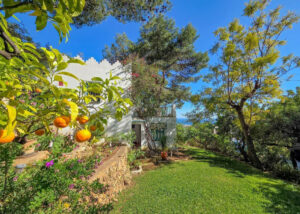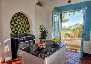 El acceso a la casa se realiza a través de un acogedor vestíbulo con techos inclinados de madera que anticipa el carácter cálido y refinado del interior. A la izquierda, el luminoso salón con chimenea inundado de la luz , creando un ambiente relajante y hogareño. La cocina, llena de color y personalidad, se abre a una espectacular terraza suspendida con impresionantes vistas al mar, rodeada de buganvillas y jacarandas.