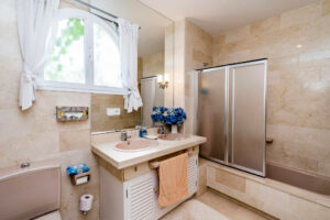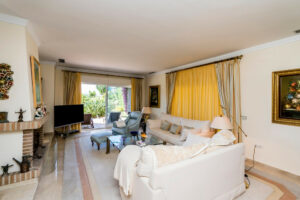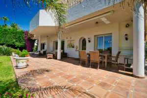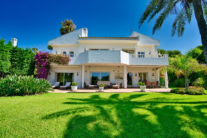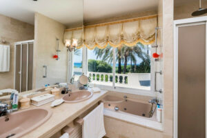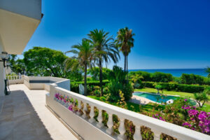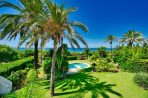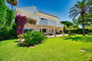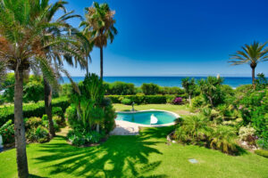 Espectacular villa en primerísima linea de playa junto al Nikki Beach en Elviria, Marbella Este, en el complejo exlusivo de Los Jardines de las Golondrinas con seguridad 24 horas. Villa construida en dos niveles con cuatro dormitorios, cuatro cuartos de baño en-suite, aseo, oficina, cocina completamente equipada y con comedor, amplio salón con chimenea y con acceso al gran porche y al jardín amplio y muy privado con piscina climatizada. Tiene su propio acceso y dispone de dos garajes independientes. Zona muy lujosa junto al Hotel Don Carlos y al Club de Tenis Don Carlos.