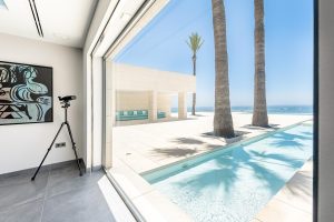 Villa contemporánea en primera línea de playa con acceso directo a una playa privada mediterránea en Mijas Costa. Rodeada de villas de estilo tradicional, la propiedad destaca por su arquitectura moderna basada en el vidrio, la geometría limpia y espacios abiertos.