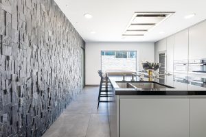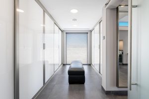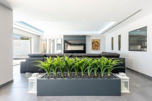 El interior se organiza en torno a la luz natural y las vistas abiertas al mar. Los ventanales de suelo a techo conectan las principales zonas de estar con amplias terrazas, integrando interior y exterior. El hall de entrada incorpora un diseño cuidado de techo e iluminación que conduce a espacios de salón y comedor de concepto abierto.