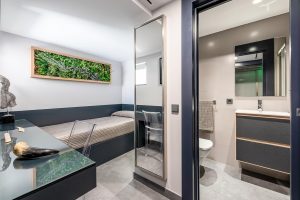 Cuatro dormitorios en suite cuentan con baño privado y sistema domótico independiente. La suite principal incluye sauna y Jacuzzi. La vivienda dispone además de despacho, aseos de invitados, lavandería, trastero y garaje para vehículo marino junto a la puerta de acceso a la playa.