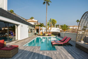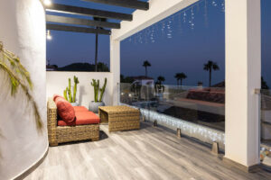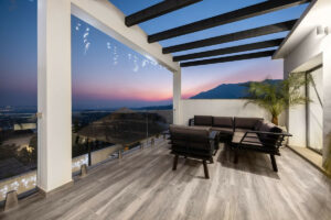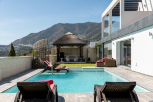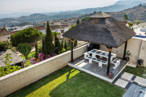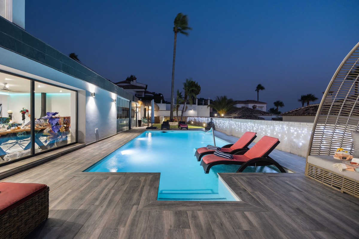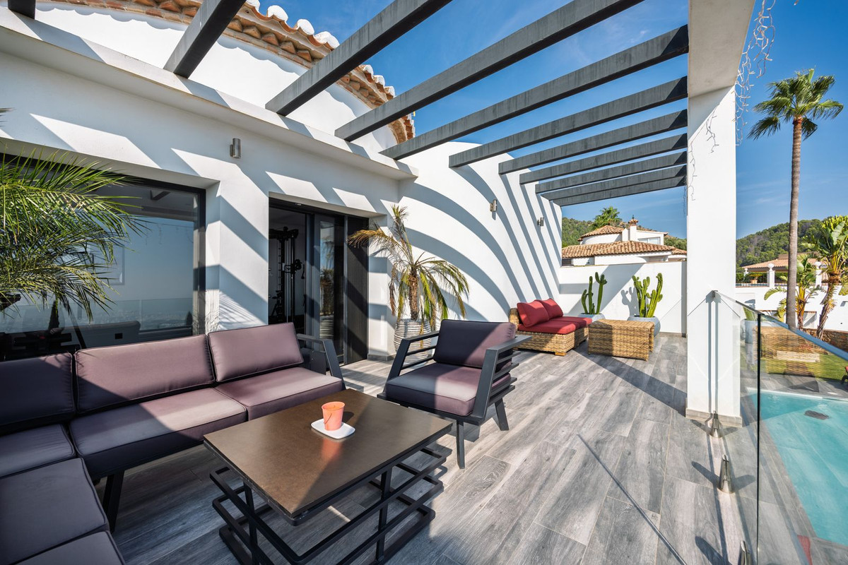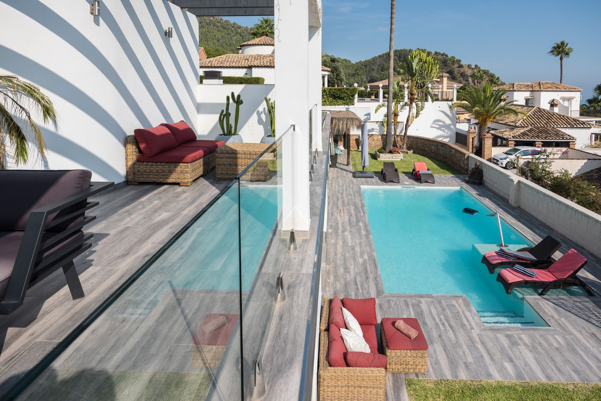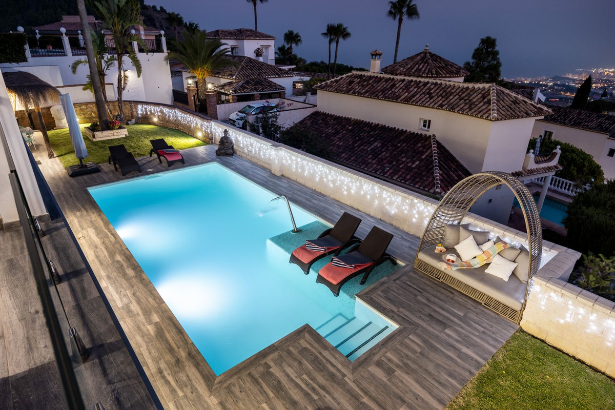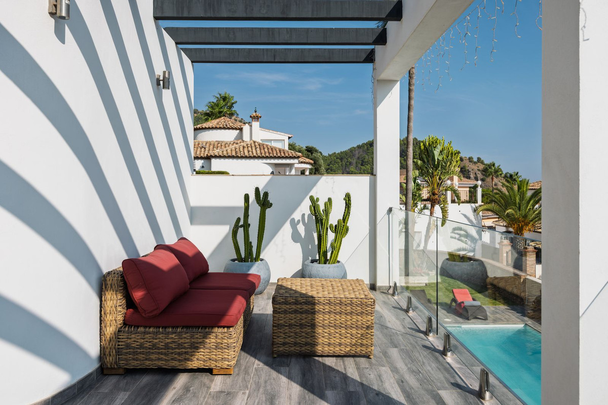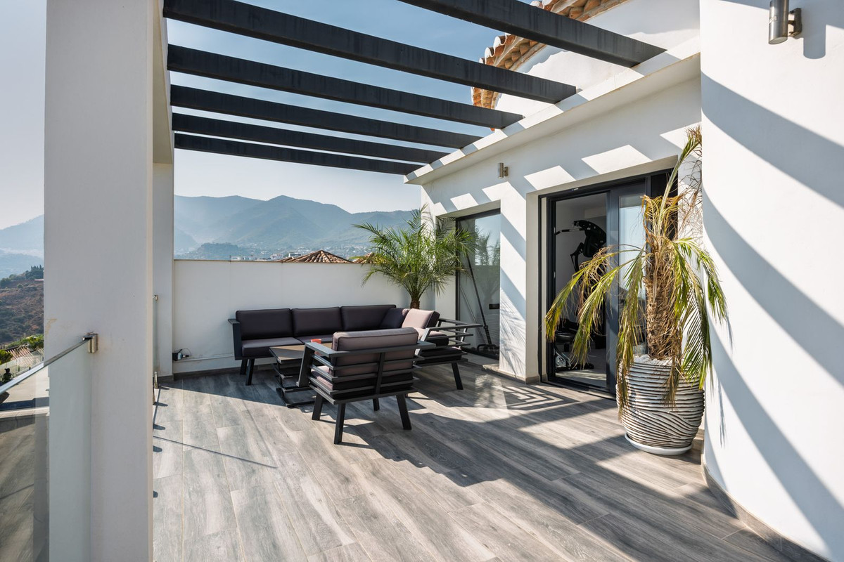 Espectacular villa que fusiona a la perfección el estilo mediterráneo con líneas contemporáneas, combinando el encanto tradicional con el confort moderno y acabados de primera calidad. Ubicada en la prestigiosa zona de Buena Vista, Mijas, ofrece un estilo de vida único en un entorno tranquilo, privado y con impresionantes vistas panorámicas al mar Mediterráneo, la costa, África y las montañas. Sobre una parcela de 800 m² y con 251 m² construidos, la vivienda se encuentra en estado impecable y lista para entrar a vivir. Su situación es inmejorable: a solo 5 minutos de Fuengirola, 2 minutos de la exclusiva zona comercial de Higuerón con todo tipo de servicios, 10 minutos de las mejores playas de la Costa del Sol y a tan solo 20 minutos del centro de Málaga y su aeropuerto. La propiedad se desarrolla principalmente en una sola planta, garantizando funcionalidad y comodidad. Al entrar, destaca la gran luminosidad y sensación de amplitud gracias al diseño de concepto abierto. La cocina moderna totalmente equipada se integra con el amplio salón con chimenea, creando un ambiente cálido que conecta con las terrazas y el jardín mediante grandes ventanales. El exterior es un auténtico refugio privado con piscina con zona de tumbonas y chorro de automasaje, zona de barbacoa para reuniones al aire libre y un jardín cuidado con árboles frutales, todo ello acompañado de vistas despejadas al mar y la montaña. La villa dispone de cuatro dormitorios. El principal, en suite con vestidor, da acceso directo a una terraza con jacuzzi privado. Otros dos dormitorios con baño propio se sitúan en el ala opuesta para mayor privacidad. En la planta superior, un espacio versátil actualmente equipado como gimnasio con baño y terraza privada, ofrece la posibilidad de convertirse en una suite independiente con vistas espectaculares. Entre sus extras destacan sala de cine, sauna, lavadero, aire acondicionado, paneles solares y garaje cerrado más porche cubierto con capacidad para tres coches. Una residencia ideal tanto para vivir todo el año como para disfrutar de escapadas de lujo en la Costa del Sol. Privacidad, confort y ubicación estratégica en una de las zonas más demandadas.