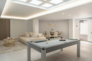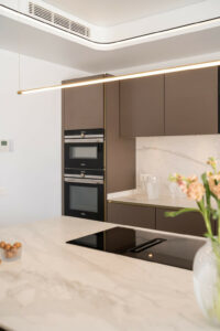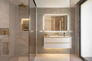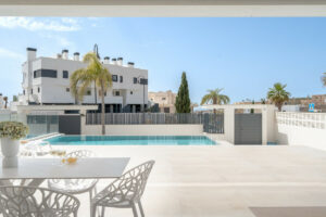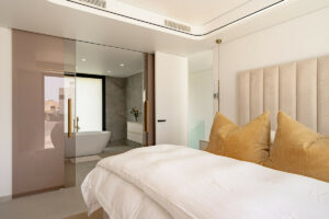 En el interior, la villa ofrece un amplio salón-comedor de planta abierta con ventanales de suelo a techo que integran la luz natural y conectan con las zonas exteriores. La cocina, equipada con electrodomésticos SIEMENS y una práctica isla central, responde tanto a un uso cotidiano como a ocasiones especiales. Los cuatro dormitorios, luminosos y confortables, incluyen una suite principal con vestidor, baño en suite y acceso a una terraza privada.
