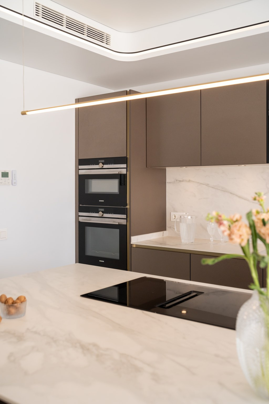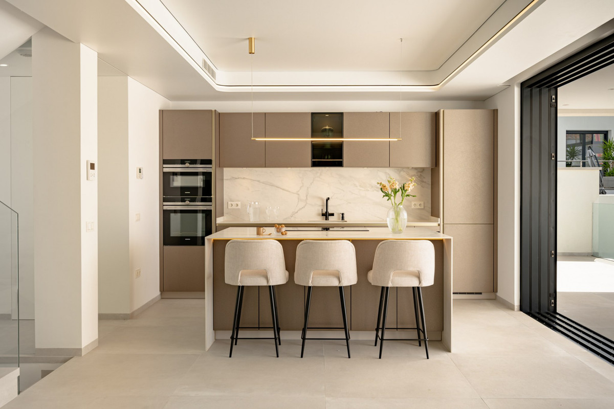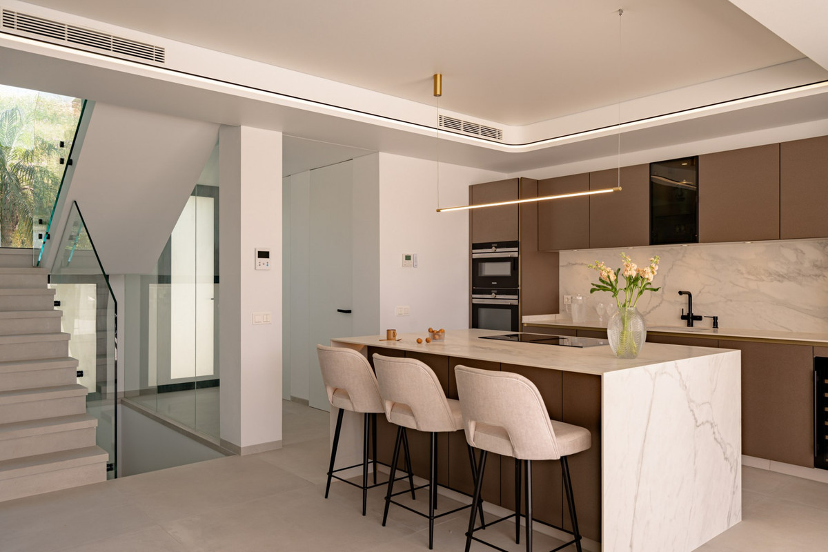 En el interior, la villa ofrece un amplio salón-comedor de planta abierta con ventanales de suelo a techo que integran la luz natural y conectan con las zonas exteriores. La cocina, equipada con electrodomésticos SIEMENS y una práctica isla central, responde tanto a un uso cotidiano como a ocasiones especiales. Los cuatro dormitorios, luminosos y confortables, incluyen una suite principal con vestidor, baño en suite y acceso a una terraza privada.