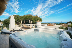 Villa en venta en , Mijas Costa con 4 dormitorios, 4 baños, 4 baños en suite, 1 aseo y con orientación sur, con piscina privada, garaje privado (2 plazas) y jardín privado. Respecto a las dimensiones, la propiedad presenta 220 m² construidos, 764 m² de parcela y 90 m² de terraza. Tiene las siguientes características servicios cercanos, transporte cercano, aire acondicionado, cocina totalmente equipada, chimenea, suelos de mármol, sala de invitados, almacén, cristal doble, barbacoa, aseo para invitados, terraza privada, salón, estudio, vistas al mar, piscina climatizada, riego automático, internet – wi-fi, terraza cubierta, vistas a la piscina, vistas a la calle, cerca de playa / mar, terraza descubierta, puertas de cristal, excelente estado, vistas urbanas, tiendas cerca y apartamento de invitados.
