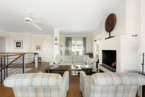 Al entrar a la casa, se le da la bienvenida a un vestíbulo luminoso y espacioso con grandes ventanas que inundan el espacio de luz natural. El vestíbulo también cuenta con armarios empotrados. Justo al frente, el área de estar y comedor de concepto abierto crea un ambiente amplio y acogedor, destacado por una hermosa chimenea abierta y una llamativa escalera. Las vistas desde este nivel son impresionantes, con panorámicas que se extienden hacia el oeste. La sala de estar conduce a una terraza de buen tamaño, perfecta para cenar al aire libre y relajarse, con espacio suficiente para un área de comedor y un acogedor salón.
