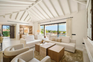 Entre y descubra una relajante paleta de tonos naturales, techos abovedados y un espacio diáfano que fluye a la perfección hacia una moderna cocina y comedor. Cada detalle ha sido cuidadosamente seleccionado, desde los elegantes acabados y el mobiliario a medida hasta los electrodomésticos de alta gama y la iluminación ambiental. Las puertas de cristal de suelo a techo invitan a la luz natural a entrar y se abren a una amplia terraza con un salón hundido, una cocina al aire libre y una impresionante piscina que parece flotar sobre el paisaje.