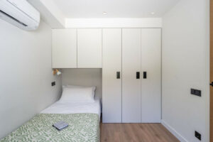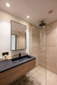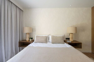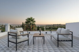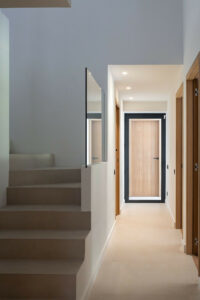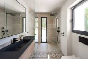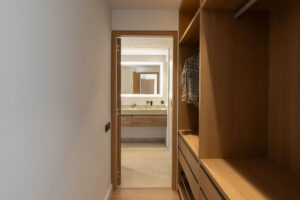 La suite principal en la planta alta cuenta con vestidor, terraza privada y un amplio baño con ducha y bañera. Además, la azotea ofrece vistas panorámicas y destellos del mar.