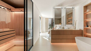 Además, en esta planta se encuentran cuatro dormitorios, todos con baño en suite y terraza propia. El dormitorio principal, con sus casi 40 m², incluye un vestidor y un baño de diseño en un espacio abierto que crea una lujosa sensación de suite. La zona de la piscina y la terraza ofrecen varias zonas de estar y fuentes conectadas a la piscina. También dispone de un garaje para buggies con acceso directo al campo de golf.