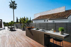 Villa de cuatro dormitorios en Nueva Andalucía con vistas abiertas al golf y al mar, distribuida en varios niveles, con piscina a nivel de jardín, cocina exterior integrada, amplias terrazas y garaje privado.