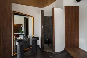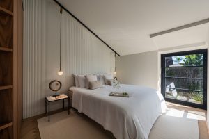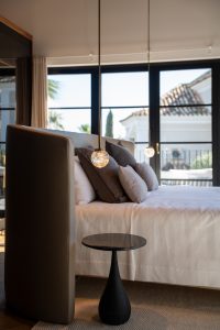 En la planta superior, la suite principal cuenta con techos abovedados en madera, vestidor abierto, lavabos escultóricos en piedra y ducha de mármol tipo walk-in. Los ventanales de suelo a techo enmarcan las vistas al golf y al mar, manteniendo la privacidad. Los dormitorios adicionales mantienen el mismo nivel de acabados y proporciones, diseñados para maximizar el confort. Elementos prácticos como lavandería independiente, vinoteca integrada, carpintería a medida e iluminación ambiental se integran de forma discreta en toda la vivienda.