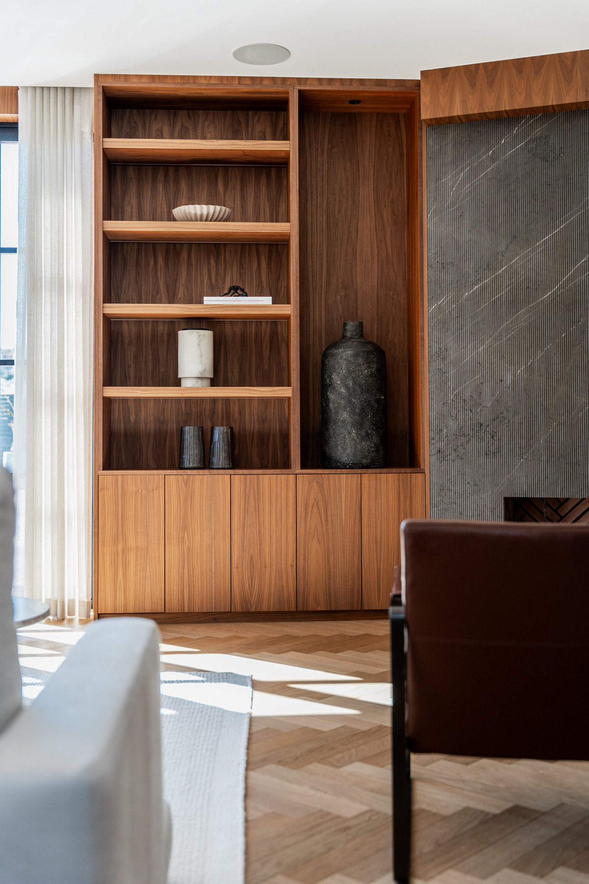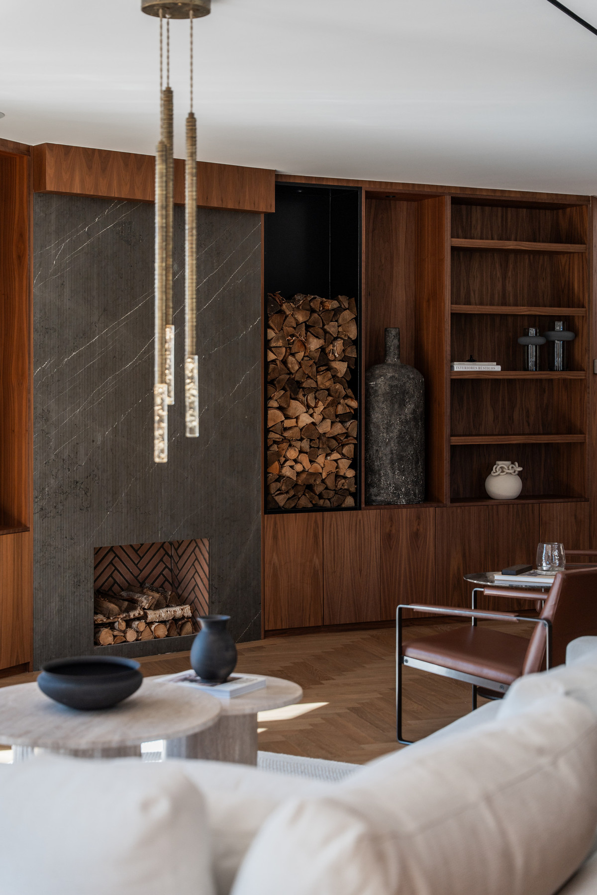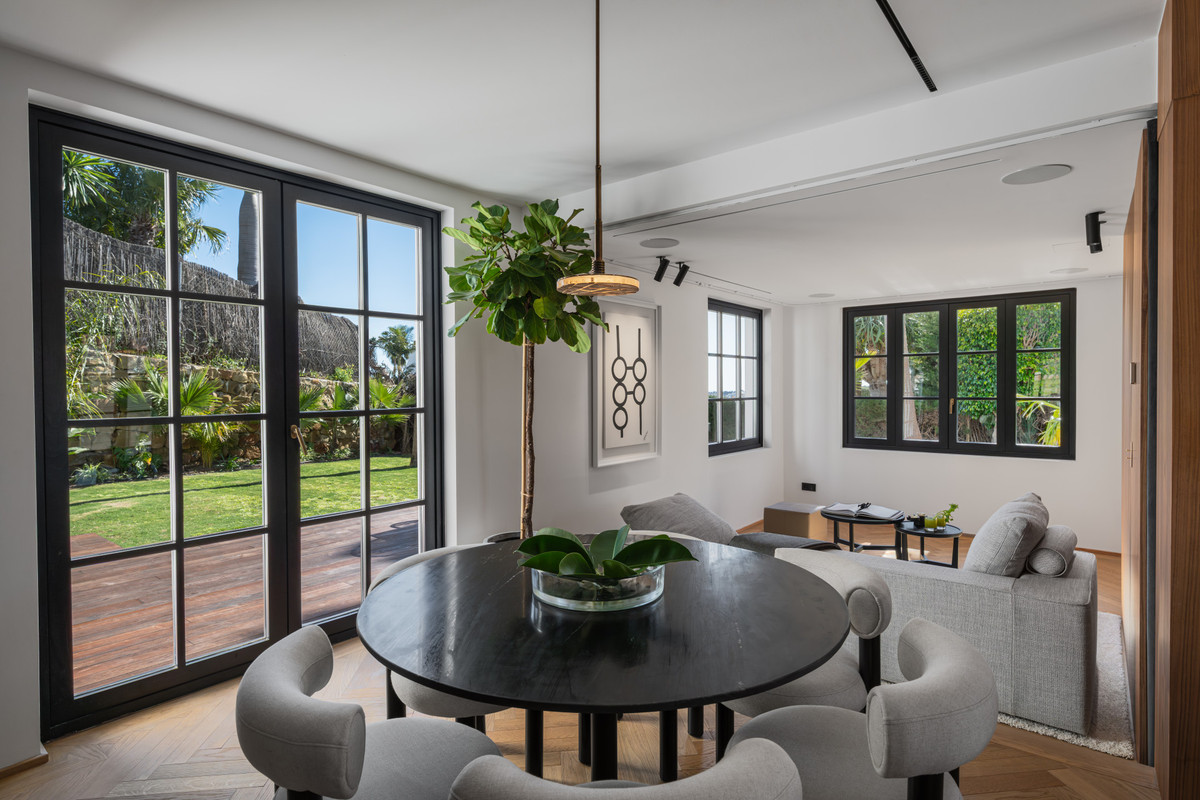 No es la típica villa del Valle del Golf. Ha sido rediseñada con una dirección arquitectónica clara, donde proporciones, materiales y distribución han sido cuidadosamente seleccionados. Desde la entrada se percibe el nivel de detalle: suelo de roble en espiga, carpintería de nogal a medida, frentes acanalados y mármol veteado oscuro, todo integrado con coherencia y equilibrio.