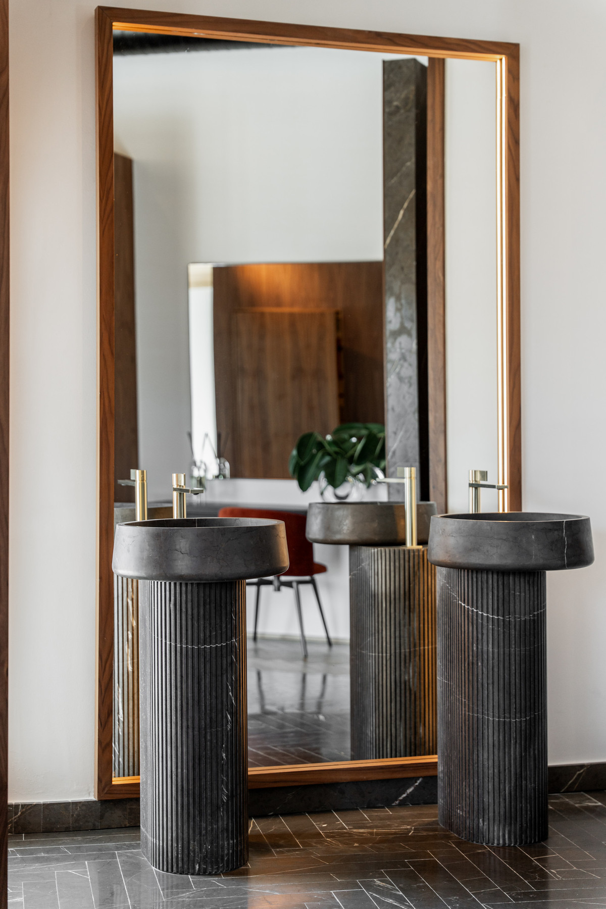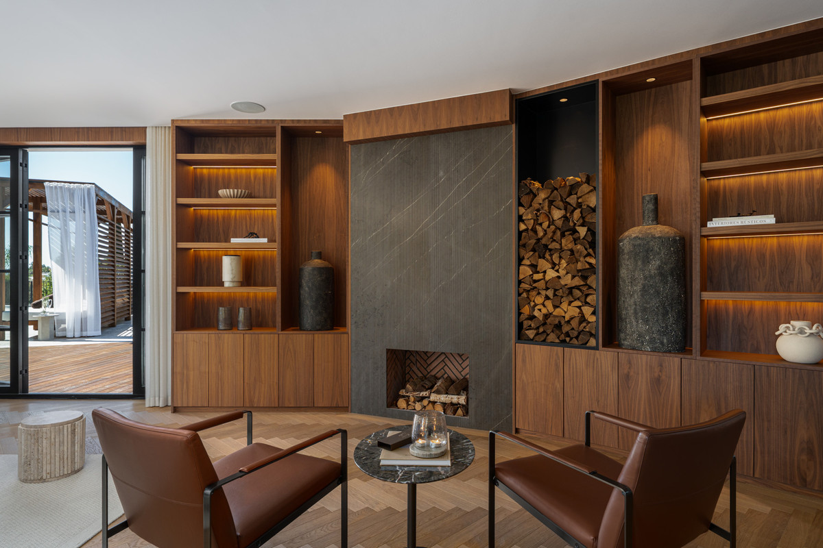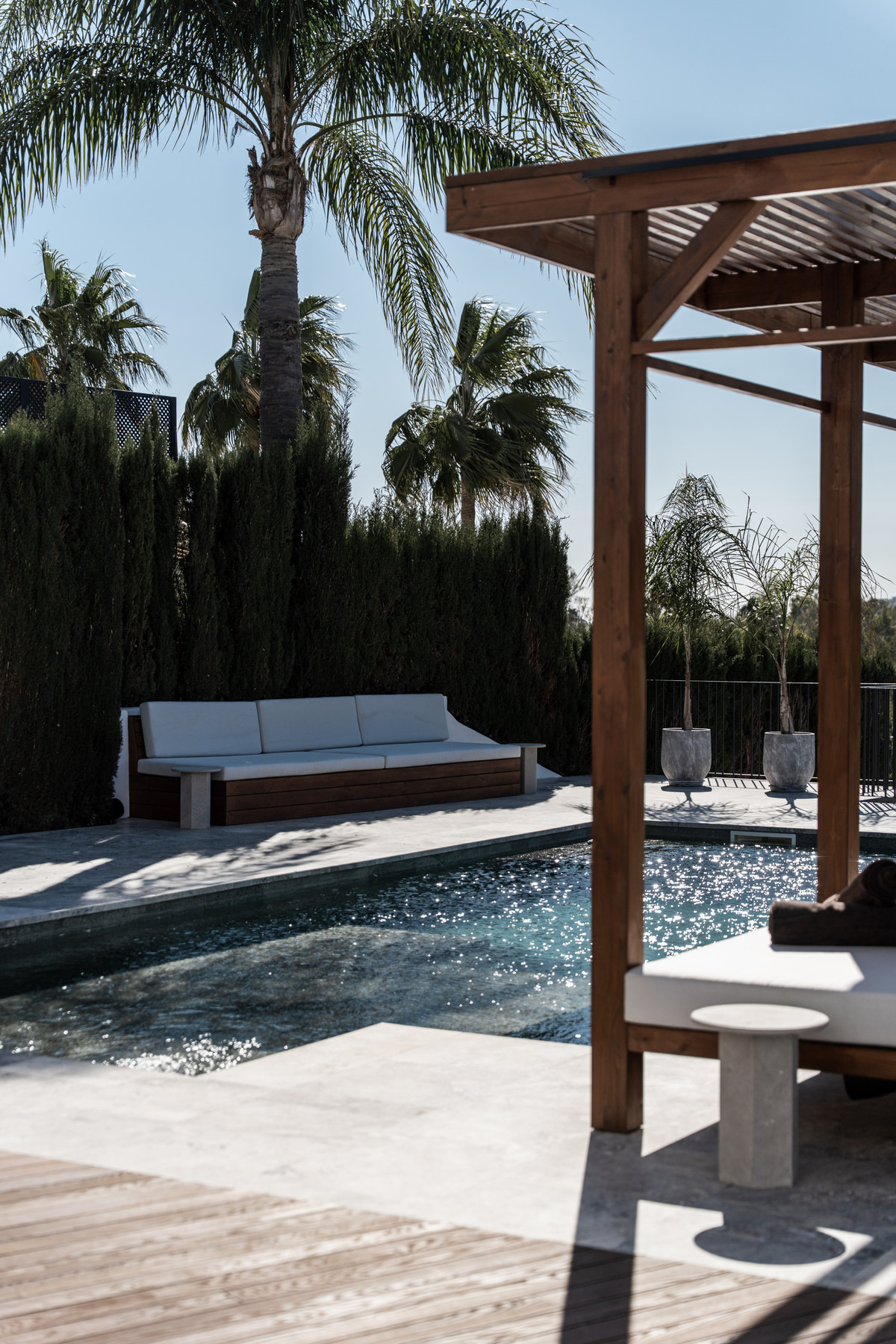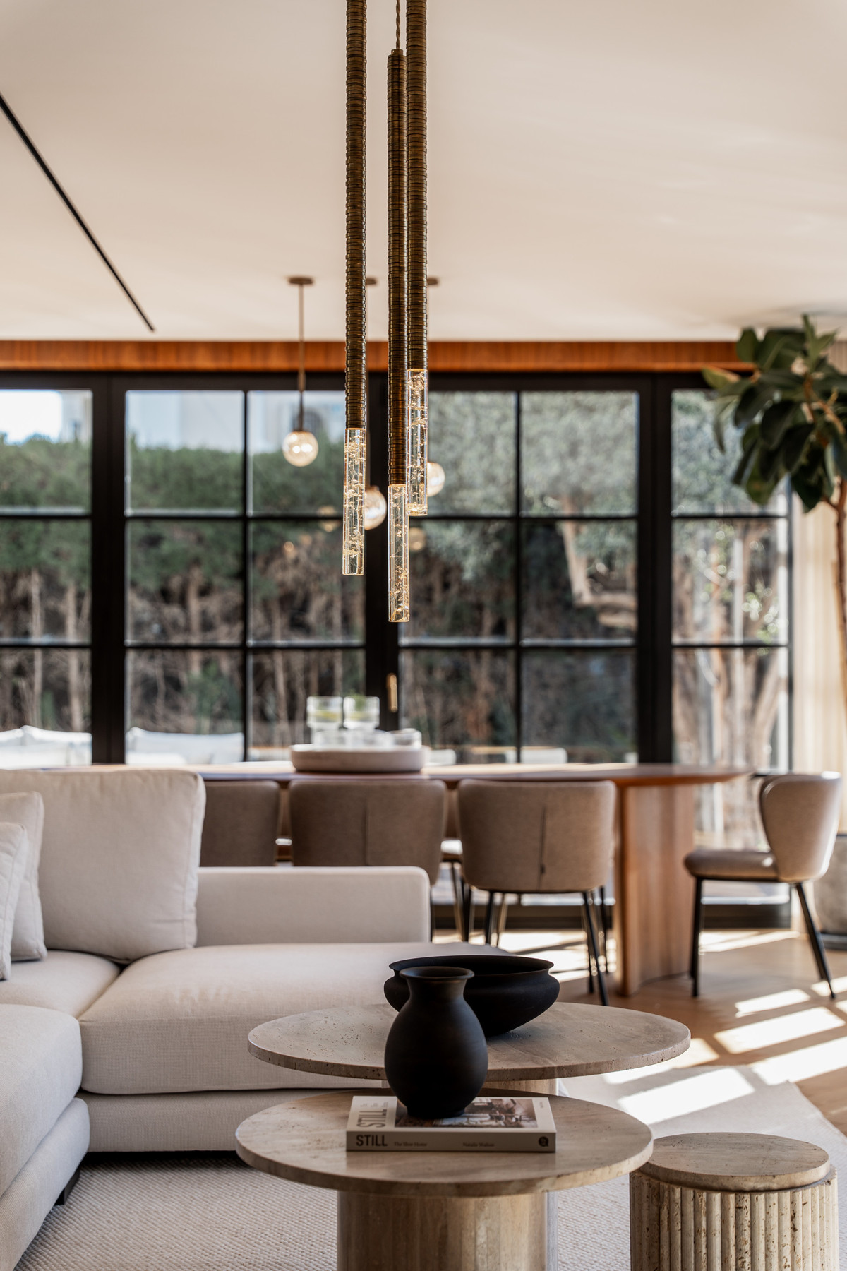 En la planta superior, la suite principal cuenta con techos abovedados en madera, vestidor abierto, lavabos escultóricos en piedra y ducha de mármol tipo walk-in. Los ventanales de suelo a techo enmarcan las vistas al golf y al mar, manteniendo la privacidad. Los dormitorios adicionales mantienen el mismo nivel de acabados y proporciones, diseñados para maximizar el confort. Elementos prácticos como lavandería independiente, vinoteca integrada, carpintería a medida e iluminación ambiental se integran de forma discreta en toda la vivienda.
