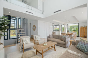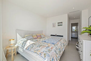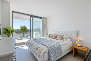 Una escalera de diseño conduce a la planta superior, donde se encuentran dos luminosos dormitorios, cada uno con baño en suite y acceso directo a una terraza privada con impresionantes vistas al mar. Los amplios ventanales garantizan una abundante entrada de luz y ofrecen vistas panorámicas de la belleza natural del entorno.