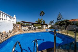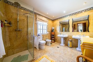 La villa principal tiene capacidad para ocho huéspedes en tres espaciosas habitaciones con baño. Los interiores están diseñados con gusto en un estilo rústico-clásico, mezclando el encanto tradicional con acabados de lujo. Las elegantes zonas de estar y comedor cuentan con una gran chimenea y amplios ventanales que inundan el espacio de luz natural y enmarcan hermosas vistas al jardín. Una cocina totalmente equipada se abre a un auténtico patio andaluz con una fuente decorativa, que ofrece un entorno sereno y elegante para cenas privadas o reflexiones tranquilas.
