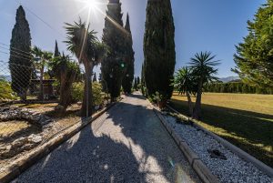 Desde el momento en que se entra por el gran camino de entrada arbolado, queda claro que no se trata de una residencia corriente. Palmeras y cipreses bordean el acceso privado, que conduce a amplias zonas de aparcamiento y exuberantes espacios verdes. Los jardines cuentan con tres impresionantes piscinas, ideales para disfrutar del abundante sol de Andalucía, así como una serie de pérgolas y terrazas que crean tranquilos salones al aire libre y elegantes espacios de entretenimiento.