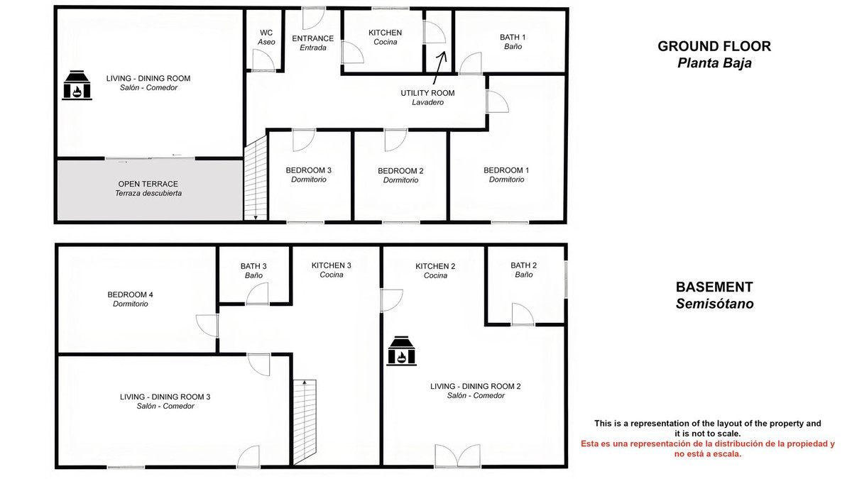 La casa está dividida actualmente en tres zonas de estar independientes que comprenden dos salones, cuatro dormitorios, tres cocinas, tres baños y un aseo/guardarropa.