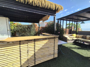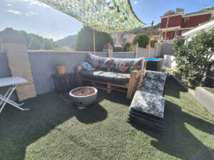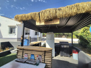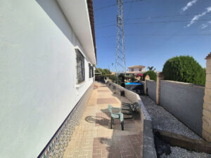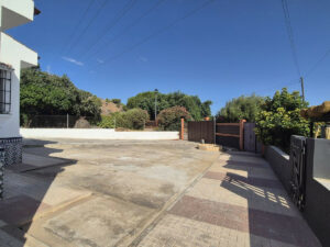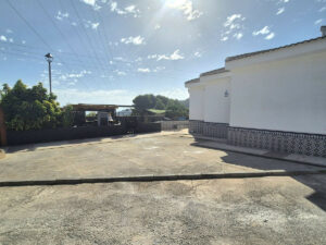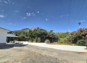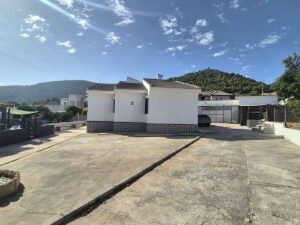La propiedad se encuentra en la parte alta de la urbanización. Se accede a la propiedad, que está completamente vallada, ya sea por un portal o por una puerta corredera eléctrica. Dispone de amplio aparcamiento para al menos 5 coches. Dispone de varias zonas de estar y diferentes espacios en el terreno para usar como desee, todo prácticamente llano. A la izquierda de la propiedad se encuentra una agradable zona de estar con pérgolas y una cocina exterior con bonitas vistas al valle y una pequeña piscina / jacuzzi. Hay dos entradas a la propiedad: la puerta principal y una entrada trasera desde la zona de aparcamiento hasta el pasillo/cocina.