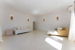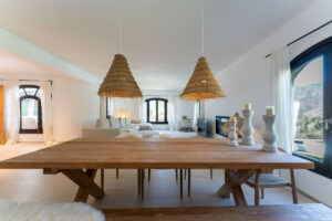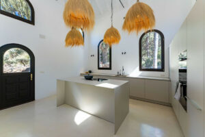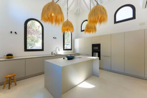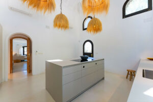 En el corazón de la finca se encuentra la residencia principal, una villa boho mediterránea de hermoso estilo diseñada tanto para la relajación como para el disfrute. Los interiores llenos de luz fluyen sin esfuerzo, desde la elegante sala de estar principal hasta una cocina espectacular con techos abovedados y una isla central donde reunirse con la familia o amigos.