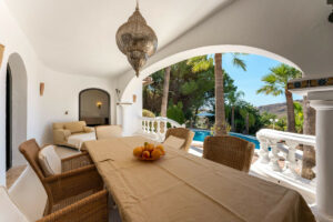• Terraza cubierta con vistas a la piscina y a los jardines.