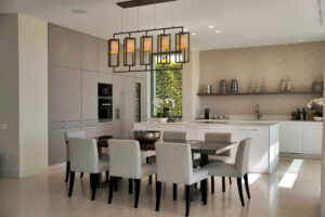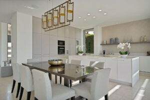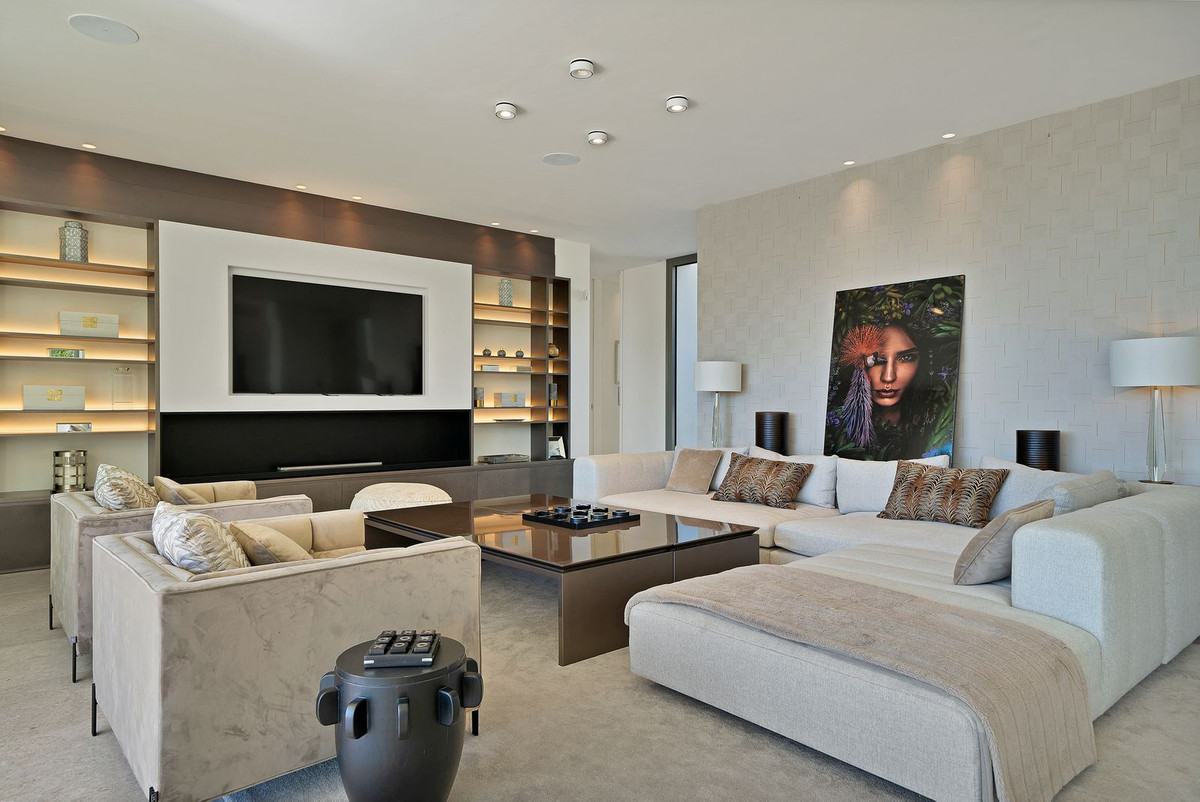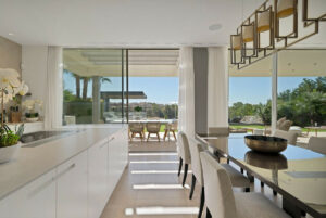 Al entrar, un majestuoso vestíbulo da paso a un espacio de vida de concepto abierto, donde las puertas de cristal de suelo a techo inundan el interior de luz natural y permiten el acceso directo a una amplia terraza cubierta, con vistas al jardín exuberante y la piscina infinita. La cocina de última generación, totalmente equipada con electrodomésticos Miele, se integra perfectamente con el comedor y la sala de estar, creando un ambiente ideal para el descanso y el entretenimiento. Junto al salón, un pasillo conduce a un dormitorio de invitados con baño en suite, actualmente utilizado como oficina, así como a un aseo de cortesía.