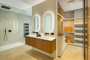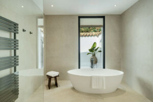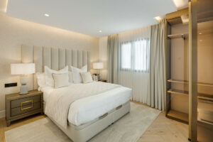 La suite principal es una característica destacada, diseñada como un retiro privado con un vestidor a medida y un lujoso baño con acabados de porcelana Villeroy & Bosch, accesorios Hansgrohe, una bañera independiente y una amplia ducha a pie. Cada dormitorio adicional mantiene el mismo estándar de artesanía, incorporando armarios Uecko y acabados bellamente detallados.