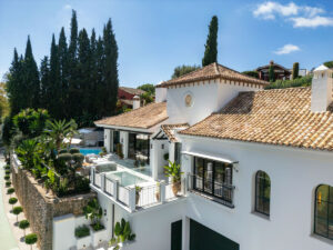 Excepcional villa en venta en la prestigiosa comunidad cerrada de El Herrojo Alto, una de las zonas residenciales más buscadas de La Quinta. Situado en una parcela de golf de primera línea elevada, esta propiedad histórica combina armoniosamente la arquitectura andaluza atemporal con el diseño moderno, ofreciendo vistas panorámicas a través del campo de golf La Quinta hacia la emblemática montaña La Concha.