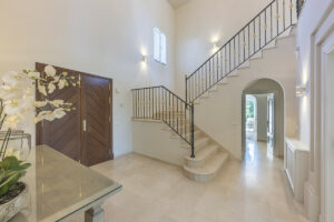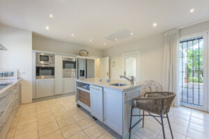 La vivienda le da la bienvenida con un majestuoso vestíbulo de doble altura que transmite de inmediato una sensación de amplitud y armonía. La casa principal consta de cuatro dormitorios en suite, tres de los cuales se encuentran en la planta superior, cada uno con su propia terraza privada con vistas al campo de golf y a los jardines paisajísticos. El cuarto dormitorio está situado en la planta baja con acceso directo al jardín, lo que lo hace ideal para invitados o para quienes prefieren vivir en una sola planta. Las zonas de día, luminosas, incluyen un amplio salón con mobiliario contemporáneo y una sala de estar independiente, ambas con acceso directo a las terrazas. Una cocina totalmente equipada con zona de desayuno y vistas al jardín complementa la distribución, mientras que un aseo de cortesía añade comodidad.