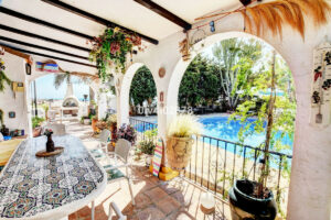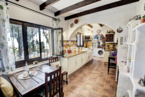 Volviendo al recibidor principal, encontrará una cocina luminosa y espaciosa, completa con una zona de desayuno que emana un encanto rústico andaluz. La practicidad es clave aquí, con un área de lavandería justo al lado de la cocina y una práctica entrada exterior para facilitar el acceso de la compra. Justo fuera de esta entrada, un área espaciosa espera para desayunar o cenar al aire libre.