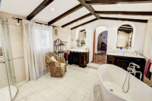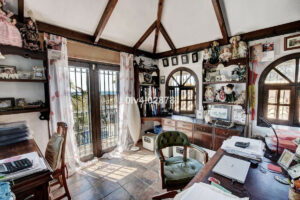 Al entrar en la villa, un acogedor recibidor marca la pauta de la elegancia clásica. Este espacio conduce al corazón de la casa: un salón amplio y espacioso, centrado en una encantadora chimenea, perfecto para las noches acogedoras. El salón da acceso a dos terrazas distintas: una que conduce directamente a la piscina, y la otra que cuenta con varias zonas de estar íntimas, todas ellas con espectaculares vistas al mar. Junto al salón se encuentra el comedor, desde donde una escalera asciende a un espacio único en la torre. Esta zona, actualmente utilizada como despacho privado, puede servir como dormitorio adicional y cuenta con un balcón privado y múltiples ventanas que enmarcan hermosas y amplias vistas.