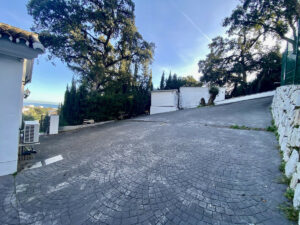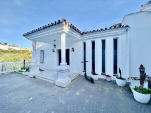 El camino de entrada es extremadamente espacioso y tiene capacidad para varios vehículos. Este conduce a una hermosa entrada a la propiedad, con puertas dobles que dan a un hermoso pasillo amplio y luminoso que conduce a un amplio salón con techos altos, chimenea y dos puertas dobles que dan a una gran terraza orientada al sur con increíbles vistas al mar. Desde la terraza se accede al solárium, que cuenta con una habitación independiente que podría convertirse en un dormitorio doble adicional.