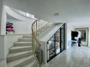 Un precioso recibidor abierto cuenta con una impresionante vitrina que puede utilizarse como armario o bodega. También hay un vestidor independiente totalmente equipado.