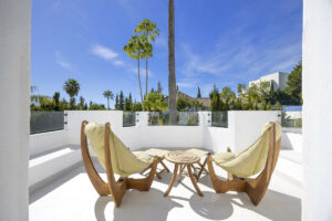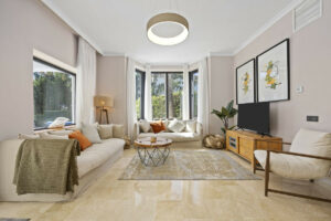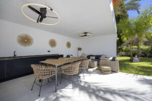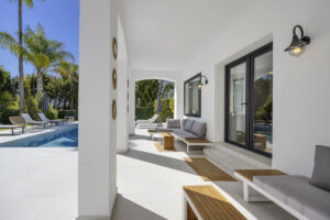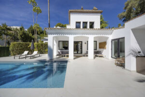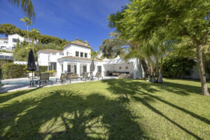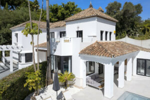 Ubicada en el Paraíso Alto, entre Marbella y Estepona, la villa combina el encanto atemporal del estilo andaluz con un toque de modernidad. Los muros blancos, los techos de tejas dan un estilo acogedor a la propiedad, en un entorno muy verde y tranquilo.