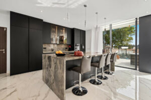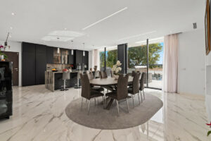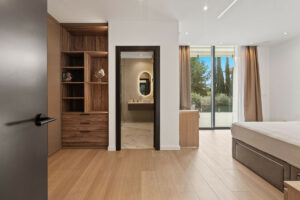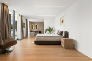 La planta principal se organiza como un espacio abierto y bien conectado, que integra un amplio salón, comedor y una cocina bajo el diseño y las calidades de Gaggenau y Miele. En este nivel se encuentran también dos dormitorios en suite, ambos con acceso directo a las terrazas y al jardín. Los grandes ventanales de suelo a techo refuerzan la sensación de amplitud y crean una continuidad natural entre los espacios interiores y exteriores.