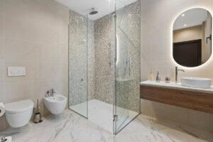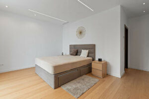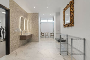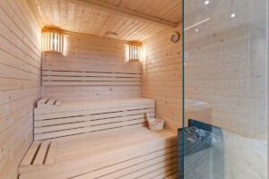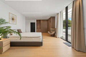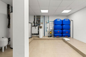 La planta inferior ha sido concebida pensando tanto en el confort como en el ocio, e incluye una zona de gimnasio, una zona de spa con sauna, jacuzzi y hammam, bodega, además de espacios destinados al entretenimiento. En este nivel se sitúan igualmente el alojamiento para el personal, zonas de almacenamiento y áreas de servicio. La vivienda está equipada con suelo radiante, sistemas avanzados de climatización, doble acristalamiento y chimenea. La eficiencia energética se ve reforzada mediante paneles solares fotovoltaicos con sistemas de baterías FVE y un sistema de agua caliente solar.